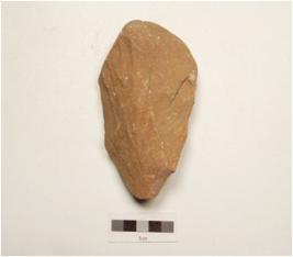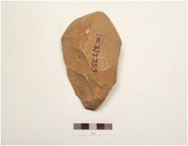 | Description / विवरण | A miniature handaxe made of quartzite pebble, flat broad at butt end cortex on butt end, intact other end, wavy cutting edge, flake scars on both surfaces and lenticular in section. |