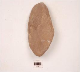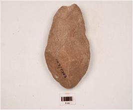 | Description / विवरण | A handaxe made on quartzite end struck flake, plano-convex in cross section, flake scars on both sides, wavy working edge and cortex partly intact on one side. |