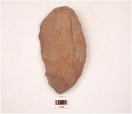 | Description / विवरण | A handaxe made on quartzite side struck flake, triangular in cross section, flake scars on both sides and wavy working edge. |