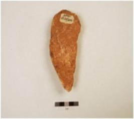 | Description / विवरण | A bifacial handaxe, made on quartzite end struck flake with flake scars on both sides and slightly broken edge, wavy working edge and lenticular in section, pointed on other end. |