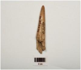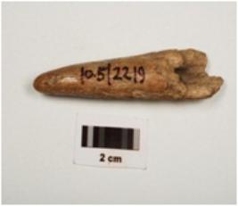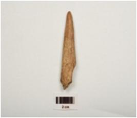 | Description / विवरण | Fragment of a point on horn with modifide and well polished surface, pointed towards one end, thicker and broken other end, brown in colour, |