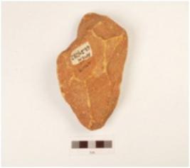 | Description / विवरण | A hand axe made on sandstone pebble, flake scars on both sides, biconvex section. |