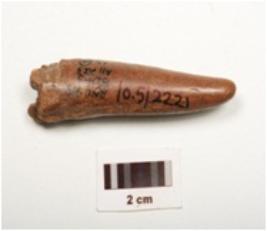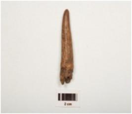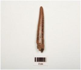 | Description / विवरण | Fragment of a point on horn with modifide and well polished surface, pointed towards one end, thicker and broken other end, brown in colour, |
