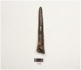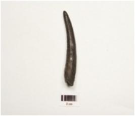 | Description / विवरण | Fragment of a point charred horn with modifide and well polished surface, pointed towards one end, thicker and broken other end, hollow in the center. |