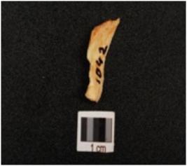 | Description / विवरण | Fragment of chert blade with improminent mid ridge, prepared platform and diffused bulb on ventral triangular in section and use wear marks on cutting edge. |