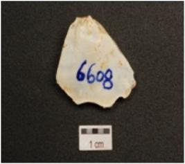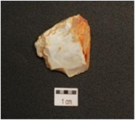 | Description / विवरण | Flake made on chert, cortex on proximal end, irregular cutting edge, bladescars on surface, prominent bulb on ventral side. |