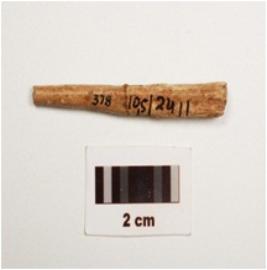 | Description / विवरण | Bone point with polished surface, broken at pointed end and triangular cross section. |
