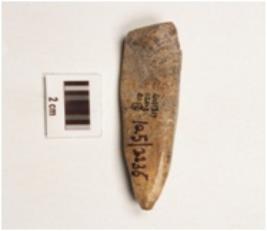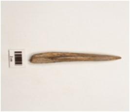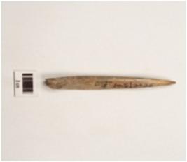 | Description / विवरण | Bone point with thick and flat surface, highly polished, pointed one end, other end thick, a groove on other side, brownish surface. |