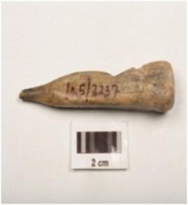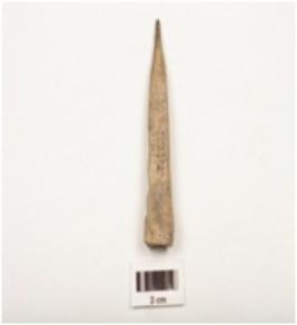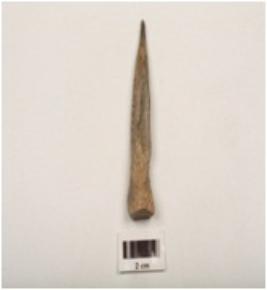 | Description / विवरण | A bone point with tapered on one end, pointed one end slightly damaged, four side ridges on surface, well polished, square in section. |
