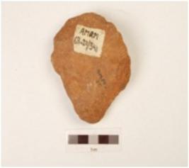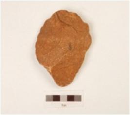 | Description / विवरण | A bifacial scraper, made on quartzite pebble with cortex on ventral, flake scars on dorsal and use wear marks on working edge. |