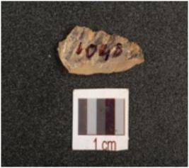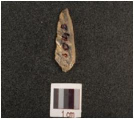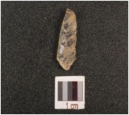 | Description / विवरण | A quartz blunted blade with single blade scar, ripple marks on dorsal and use wear marks on right cutting edge. |