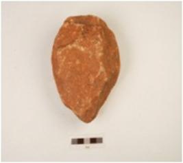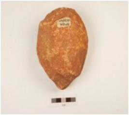 | Description / विवरण | A chopping made on sandstone pebble with flake scars on both side and biconvex in section, use wear marks on working edge. |
