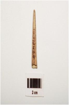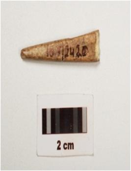 | Description / विवरण | Bone point with polished surface, slightly broken at pointed end and rectangular cross section. |