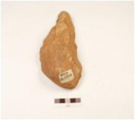 | Description / विवरण | A hand axe made on quartzite pebble, flake scars on one side, plano convex section, visible cortex at butt end, prepared platform at proximal end. |