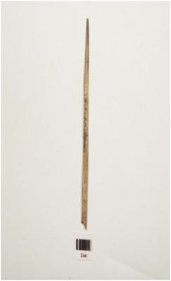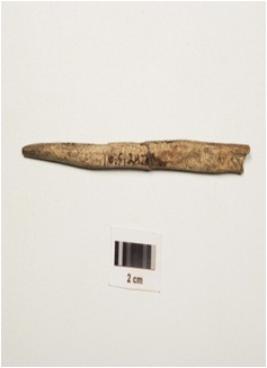 | Description / विवरण | Bone point with polished surface at one side porous surface at other side, slightly broken at pointed end and rectangular cross section. |