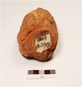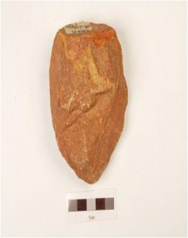 | Description / विवरण | A bifacial handaxe made on quartzite pebble with flake scars on dorsal side, cortex on surface and wavy working edge, triangualr in section. |