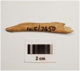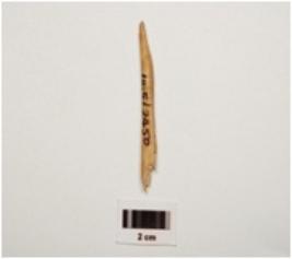 | Description / विवरण | Fragment of a bone point with polished surface, partly broken both ends and light brown in colour. |