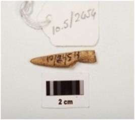 | Description / विवरण | Fragment of a bone point, smooth surface with a pointed end, partly broken from other end, light brown in colour and rectangular in section. |