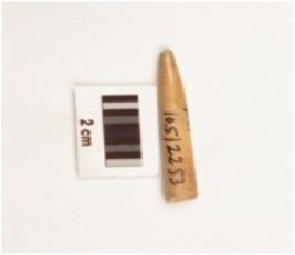 | Description / विवरण | Fragmentry bone point tapering towards pointed end, polished and smooth surface, plano-convex in section, brown in colour, other end is broken. |