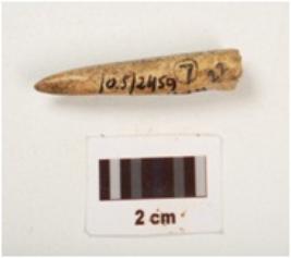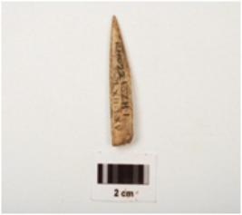 | Description / विवरण | Fragment of a bone point, smooth surface with a pointed end, partly broken from other end, light brown in colour and rectangular in section. |