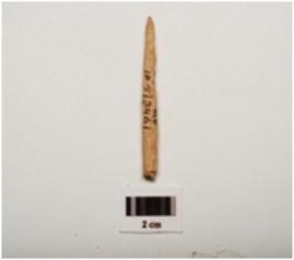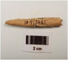 | Description / विवरण | A bone pointed polished and uneven surface with one pointed end broken from other end, cream in colour and circular in section. |