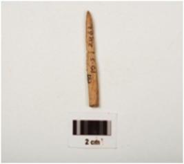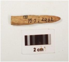 | Description / विवरण | Fragment of a bone point, smooth surface with a pointed end, partly broken from other end, light brown in colour and square in section. |