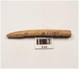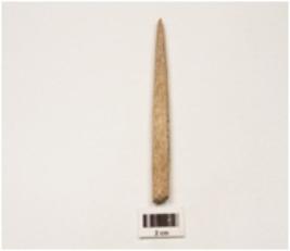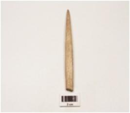 | Description / विवरण | Fragment of a bone point tapering towards a pointed end, grain son surface, light brown in colour, plano-convex in section, broken along other end. |