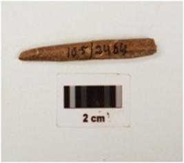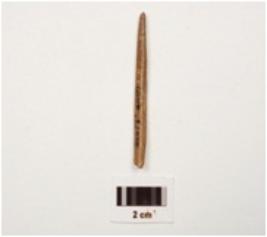 | Description / विवरण | Fragment of a bone point, polished surface with a pointed end, partly broken both ends, brown in colour and circular in section. |