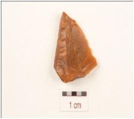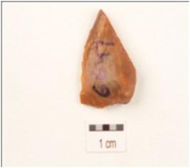 | Description / विवरण | Flake made on end struck flake, prepared platform on proximal end, bulb on ventral side, use wear marks on working edges. |
