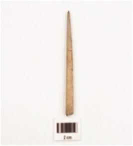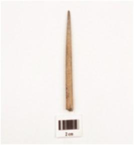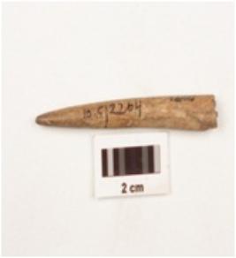 | Description / विवरण | Fragment of a bone point tapering towards a pointed end, polished surface, brown in colour, circular in section, broken along other end. |