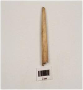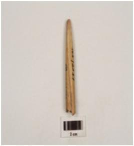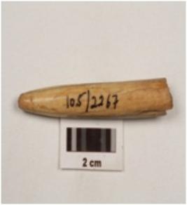 | Description / विवरण | Fragment of a bone point tapering towards a pointed end, smooth and polished surface, circular in section, light brown in colour, broken along other end. |