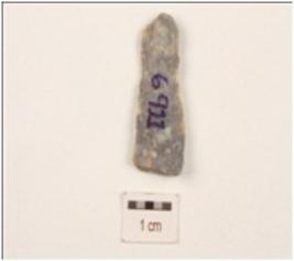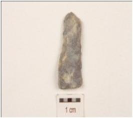 | Description / विवरण | Fragment of a blade made on chert with double ridge on dorsal side, prominent bulb on ventral side, distal end is broken use wear marks along the cutting edge. |