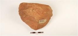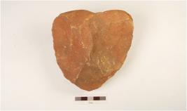 | Description / विवरण | A hand axe made on quartzite pebble, cortex visible at butt end, large flake scars on both sides, plano convex section. |