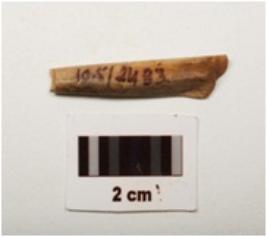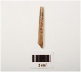 | Description / विवरण | Fragment of a bone point, polished surface, both ends are broken, light brown in colour and rectangular in section. |