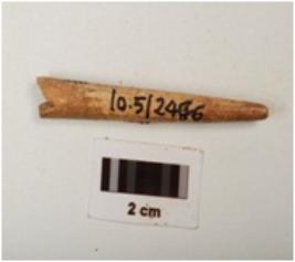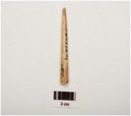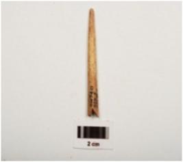 | Description / विवरण | Fragment of a bone point polished surface with a pointed end, partly broken from other end, brown in colour and circular in section. |