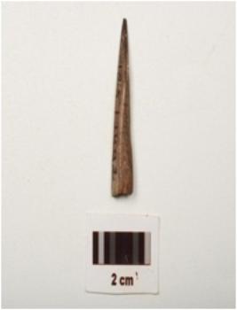 | Description / विवरण | Fragment of bone point , polished surface with a prominent ridge and one pointed end, partly broken at other end dark brown in colour and triangular in section. |