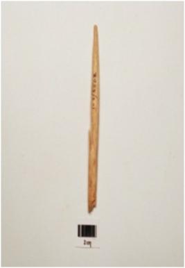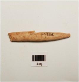 | Description / विवरण | Bone harpoon with one barbs and polished surface, partly broken from one end, rectangular in section and cream in colour. |