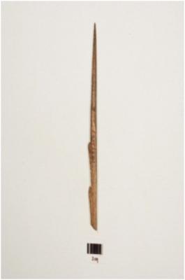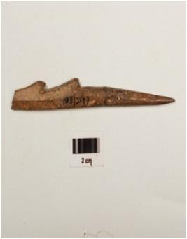 | Description / विवरण | Long bone harpoon with partly broken two barbs, polished surface, oval in section from broken end and pointed at other end, grey in colour broken and mended. |