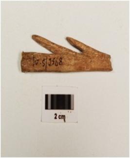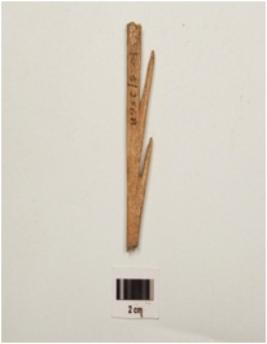 | Description / विवरण | Bone harpoon with two barbs, long in size, pointed at one end and square in section from broken end, light brown in colour, broken and mended. |