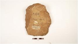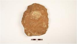 | Description / विवरण | Cleaver with flake scars on both surface, a broad working edge with retouches, other end slightly thick, made on flake, retangular cross section. |
