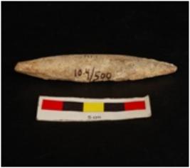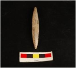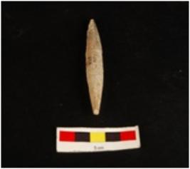 | Description / विवरण | Bone point long barrel shaped, pointed ends, broad from middle, grey in colour. |