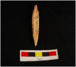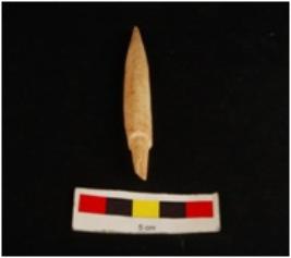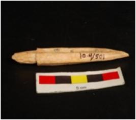 | Description / विवरण | Bone arrow head deppression on surface, long barrel shape. Yellowing natural texture is visible. Slightly curved from one end. |