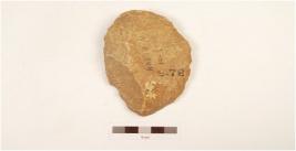 | Description / विवरण | Side scraper, end struck with positive bulb on ventral side, striking platform on one end, flaking visible on both sides, retouches on working edge. |
