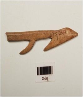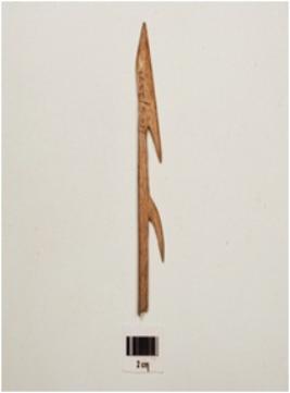 | Description / विवरण | Bone harpoon with two sharp pointed barbs , pointed at one end and polished surface, circular in section, brown in colour and broken from one end. |