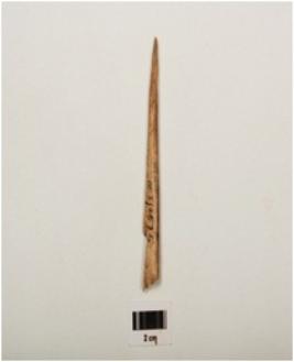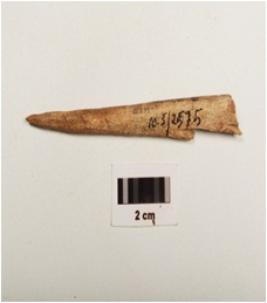 | Description / विवरण | Bone harpoon with partly broken one barb, smooth and three incised line on surface, pointed towards pointed end and broken from other end, circular in section and light brown in colour. |