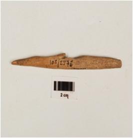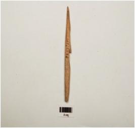 | Description / विवरण | Long bone harpoon with partly broken one barb, polished surface, pointed at one end, oval in section and cream in colour. |