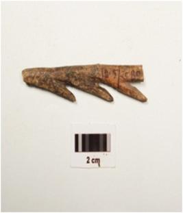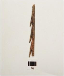 | Description / विवरण | Charred Bone harpoon with three pointed barbs and smooth surface, square in section and partly broken from both ends, broken and mended. |