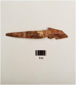 | Description / विवरण | Fragment of a bone point, polished surface with a pointed end, partly broken from other end, dark brown in colour and square in section. |