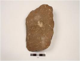 | Description / विवरण | A cleaver made on quartzite end struck flake, flake scars present on ventral side, bulb absent with sharp wavy cutting edges, plano convex in section. |