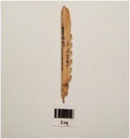 | Description / विवरण | Bone harpoon with six barbs on one side, polished surface, rectangular in section and cream in colour broken from both ends. |